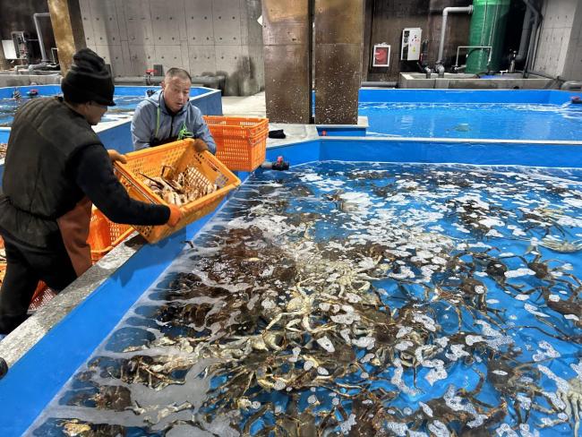 在经开区另一个厂区,山东源远海洋科技有限公司的智能暂养系统同样引人注目。一排排暂养池整齐排列,池水清澈,气泡翻涌。山东源远海洋科技有限公司项目负责人王秀民蹲在池边观察帝王蟹:“你看这只,刚来的时候蔫头耷脑的,现在多精神。帝王蟹从深海捕捞上来,经过长途运输其实很疲惫。我们的作用,就是给它们建个‘疗养院’。”
